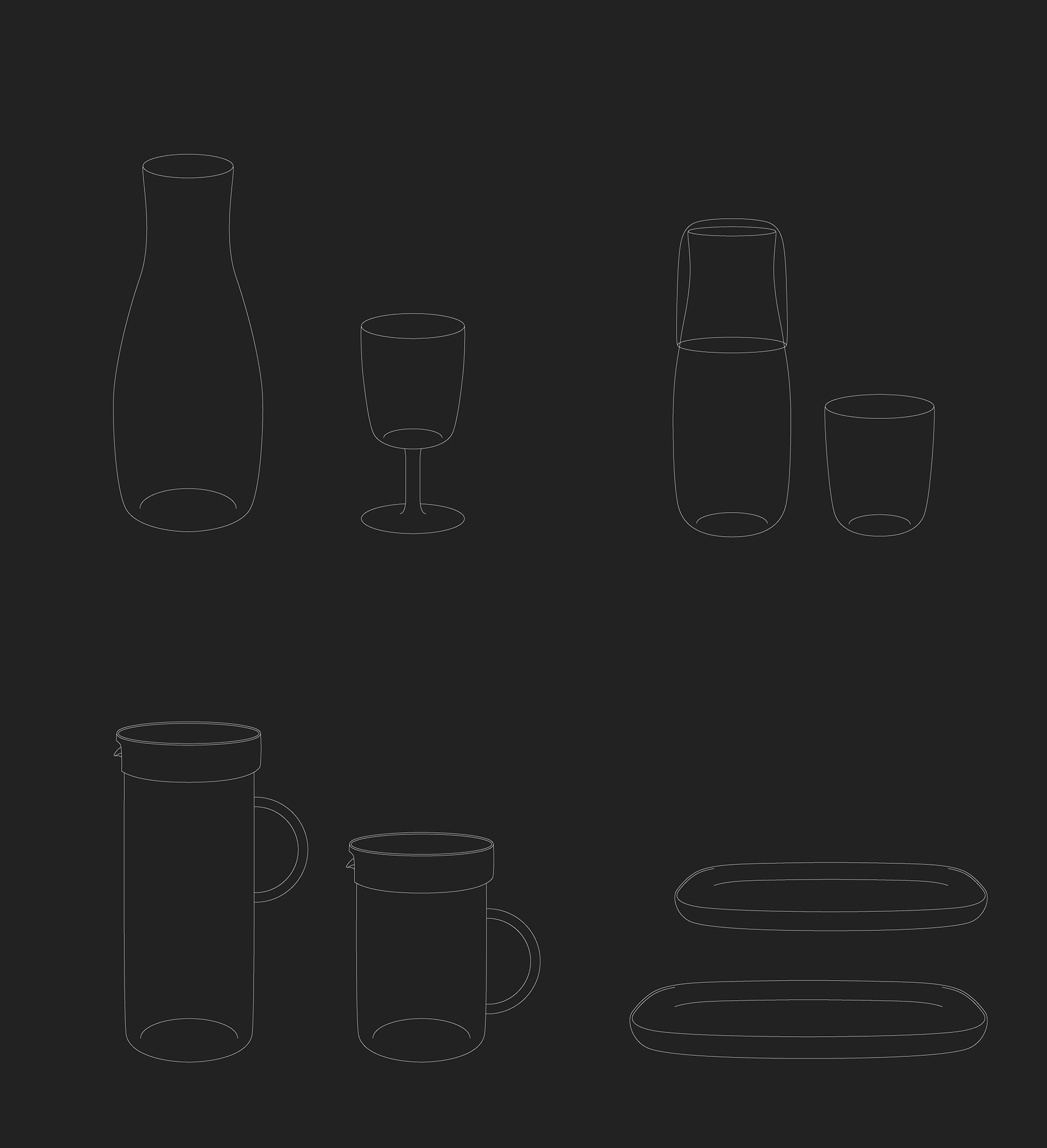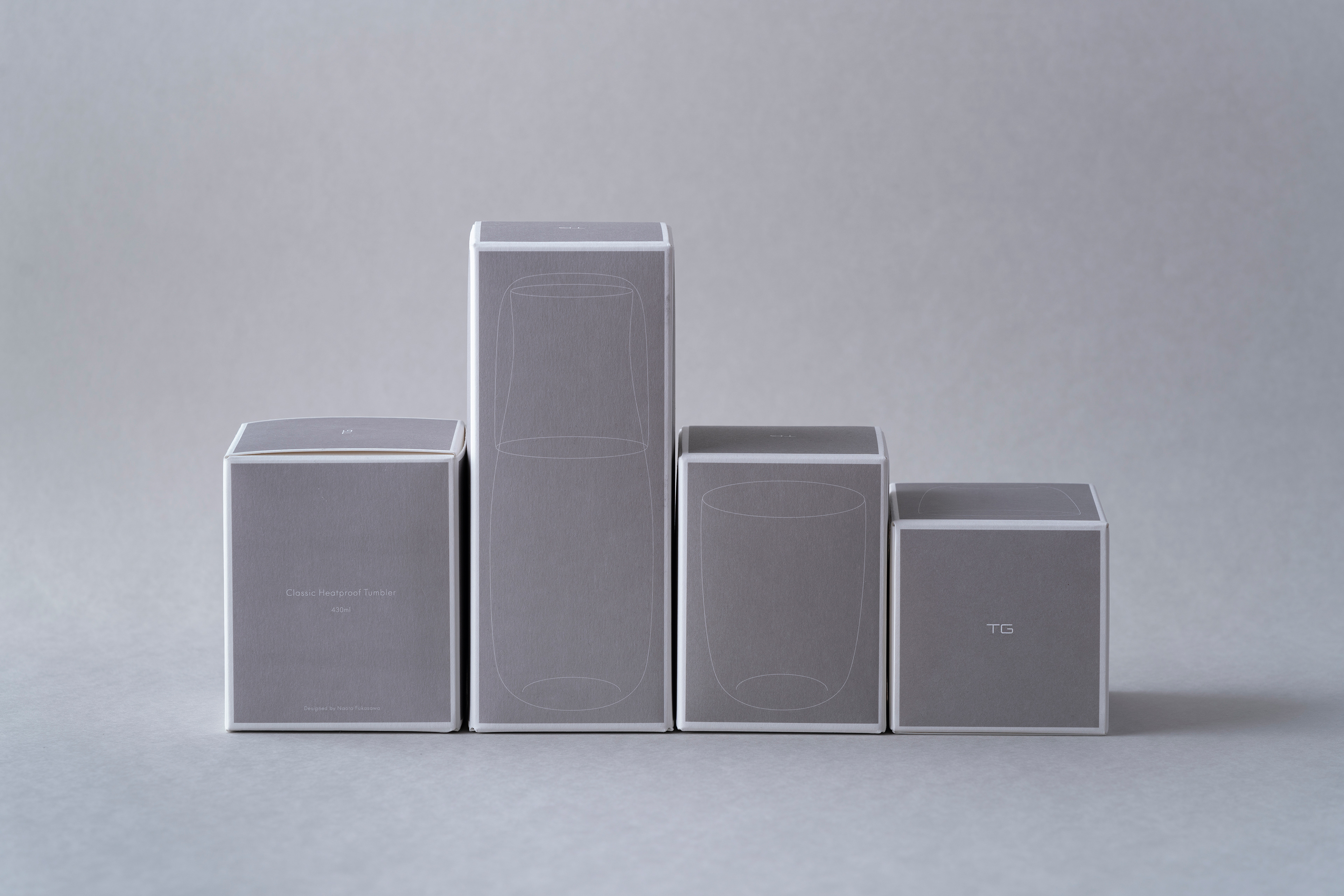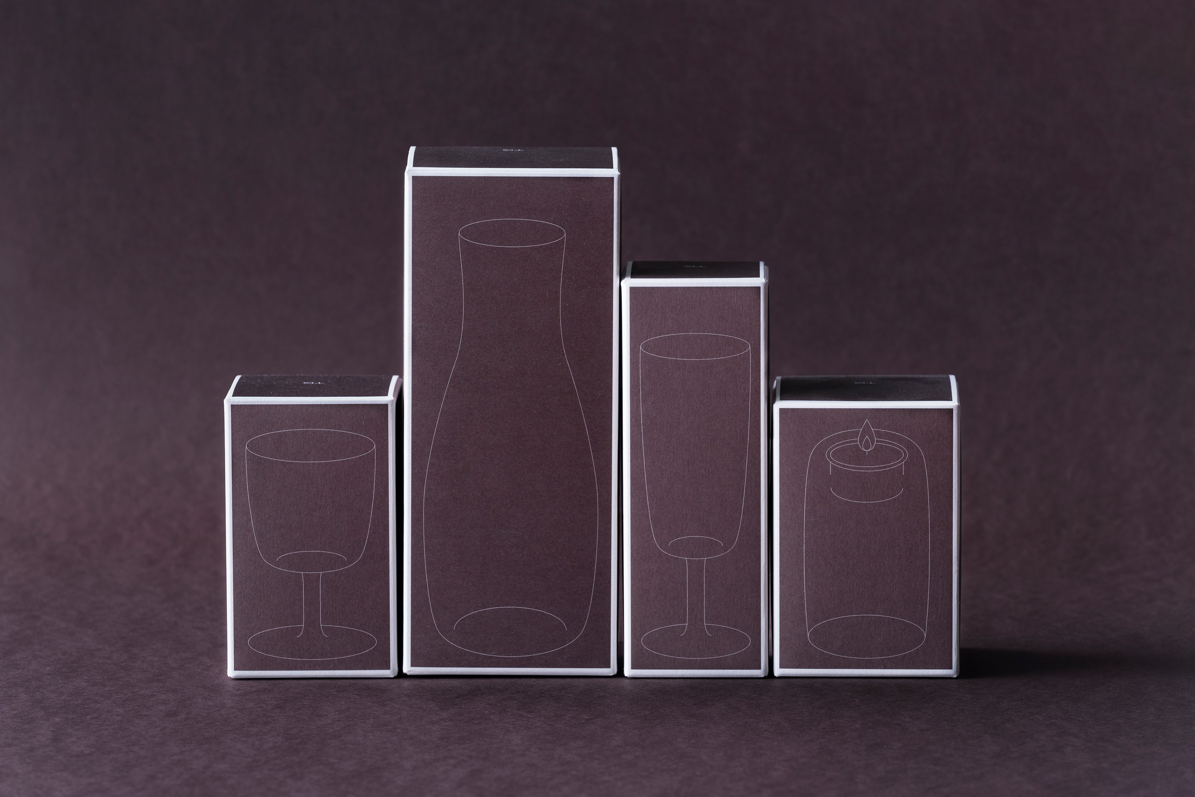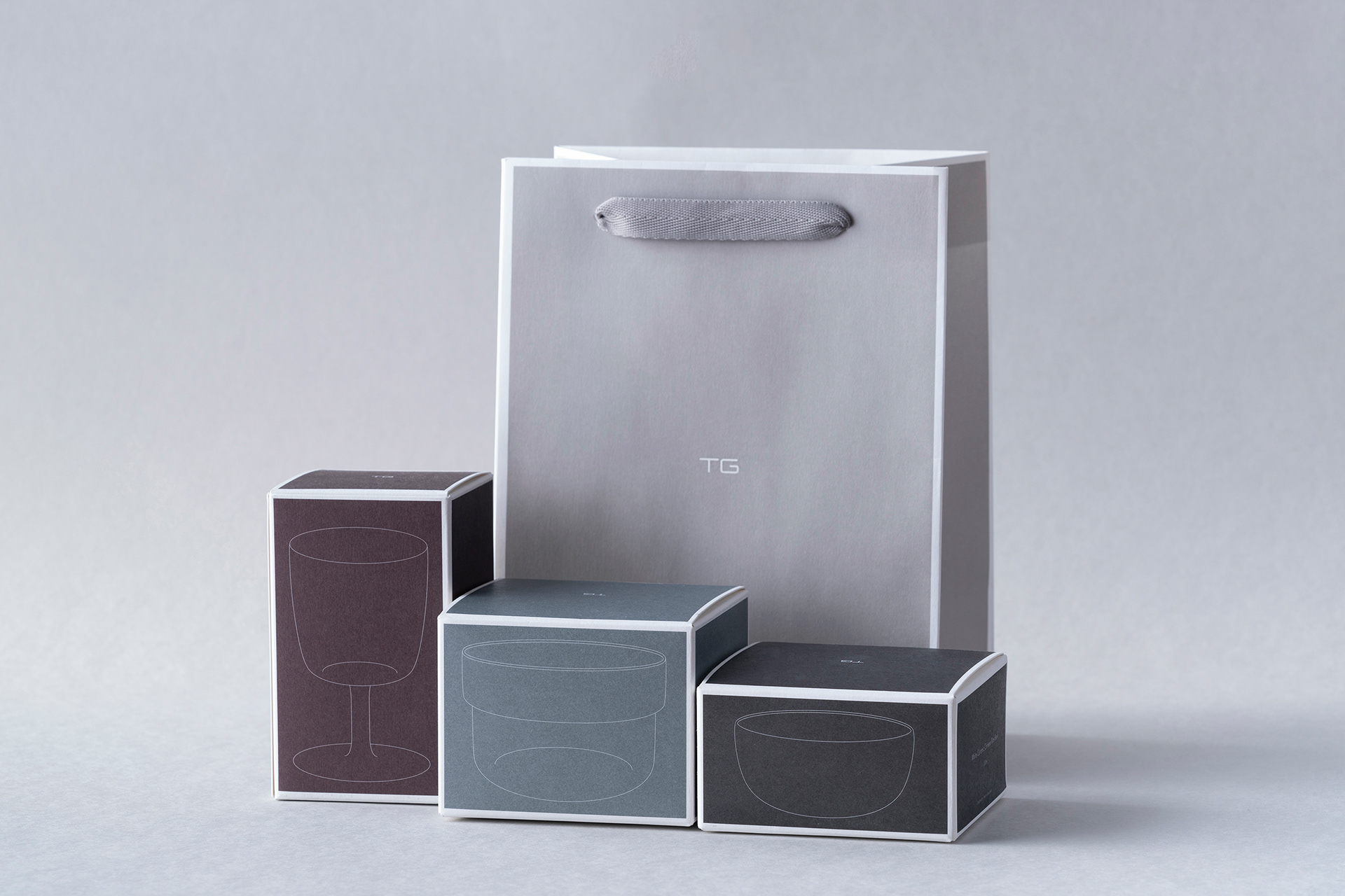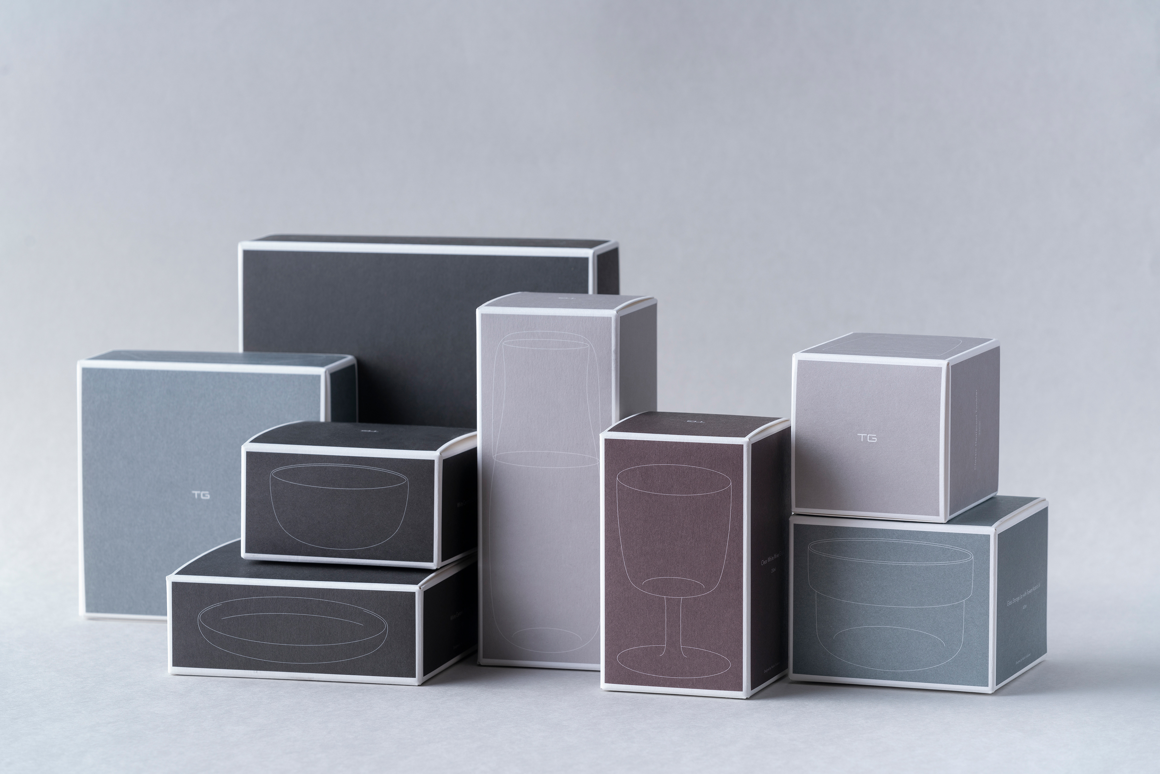 包裝設計以灰色為主要基調,四種灰色帶出產品四大區塊,玻璃器皿、陶瓷器皿、咖啡用具及家居飾件、複合材質器皿。彩盒染渲四種基色,印上每件產品的線稿,呼應其簡潔與獨一無二,盒面的四圍留白框畫出品牌優雅的氛圍。