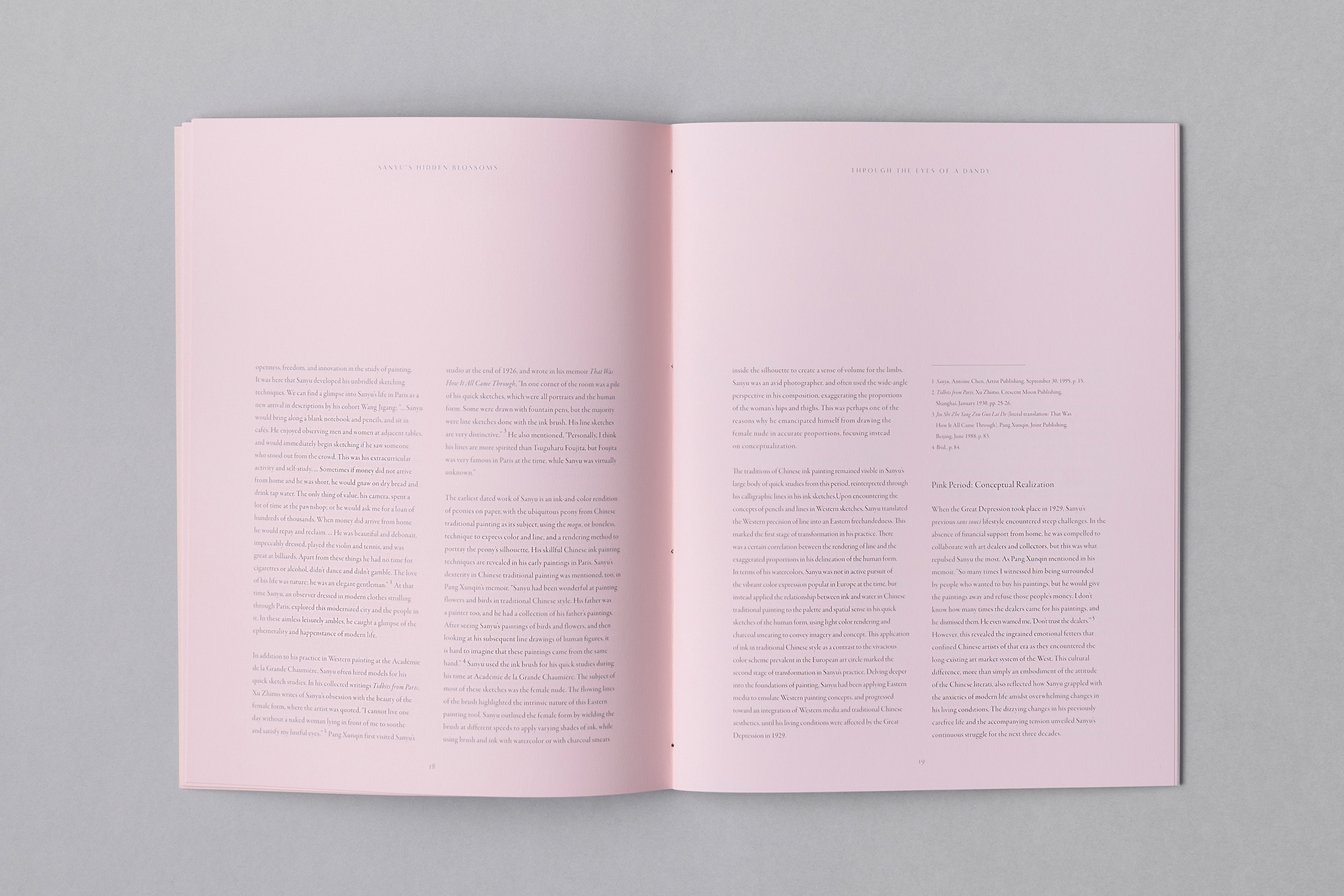 為此,畫冊視覺以粉色為主要風格,不齊邊的封面羊毛紙半掩著常玉名作裸女圖,等待觀者打開浪蕩子之美學。畫冊以羊毛紙為封面材質,搭配縫線裝訂,字體、色彩風格呼應著粉色時期。